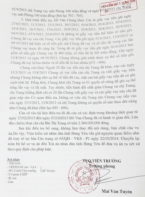 Điều này cho thấy, quan điểm của cơ quan truy tố và cơ quan xét xử là rất khác nhau. Sự thay đổi này đã phần nào thể hiện vụ án có những dấu hiệu oan, sai. Mặc dù HĐXX đã loại đi 19 giấy vay tiền và thay đổi tội danh từ “tội lừa đảo chiếm đoạt tài sản” sang “tội lạm dụng tín nhiệm chiếm đoạt tài sản”, song việc kết tội bị cáo theo quy định tại điểm d khoản 2 Điều 140 BLHS còn khiên cưỡng, không vững chắc. Không thể căn cứ vào lời khai Chung vay tiền cá độ bóng đá qua mạng Internet để xác định bị cáo vay tiền sử dụng vào mục đích bất hợp pháp vì cơ quan điều tra đã xác minh và kết luận không đủ căn cứ và Chung cũng không thừa nhận lời khai này tại phiên tòa. Các chứng cứ khác chứng minh việc Chung cá độ bóng đá không có. Hành vi vay 160 triệu này thể hiện tại Giấy vay tiền ngày ngày 02/9/2013 xét thấy bản chất không khác gì toàn bộ các lần vay khác nên việc quy kết trách nhiệm cho bị cáo phạm tội hình sự chiếm đoạt tài sản của chị Trang - chủ nợ là không đủ căn cứ.
