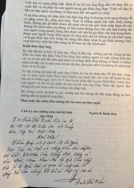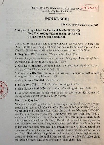 Theo Đơn đề nghị gửi ĐBQH có gửi đến đồng chí Chánh án TAND TP Hà Nội, Viện trưởng VKSND TP. Hà Nội và các cơ quan ngôn luận ngày 08/7/2017, ông Quản Đắc Lâm, cựu công an viên (là người trực tiếp nghe, làm việc với những người có mặt tại hiện trường xảy ra vụ xô sát chiều ngày 19/7/2003), ông Lê Minh Đức - cựu trưởng thôn (là người trực tiếp đo và ký hợp đồng giao đất cho gia đình các bị cáo), ông Quản Tiến Đức - Tổ trưởng Tổ Mặt trận (là người có mặt tại hiện trường chứng kiến vụ xô sát), ông Nguyễn Văn Sinh - Cựu Bí thư thôn Vân Côn, bà Nguyễn Thị Áp - Chi hội trưởng Hội nông dân thôn Vân Côn, ông Nguyễn Đình Mậu - Cựu trưởng thôn những năm sau khi xảy ra vụ xô sát cùng rất nhiều những người dân có đất xung quanh nơi xảy ra sự vụ được trực tiếp chứng kiến chiều ngày 19/7/2003… đã cam đoan và khẳng định rằng không có hành vi chém nhau, người bị hại không bị chém mà chạy và bị ngã.
