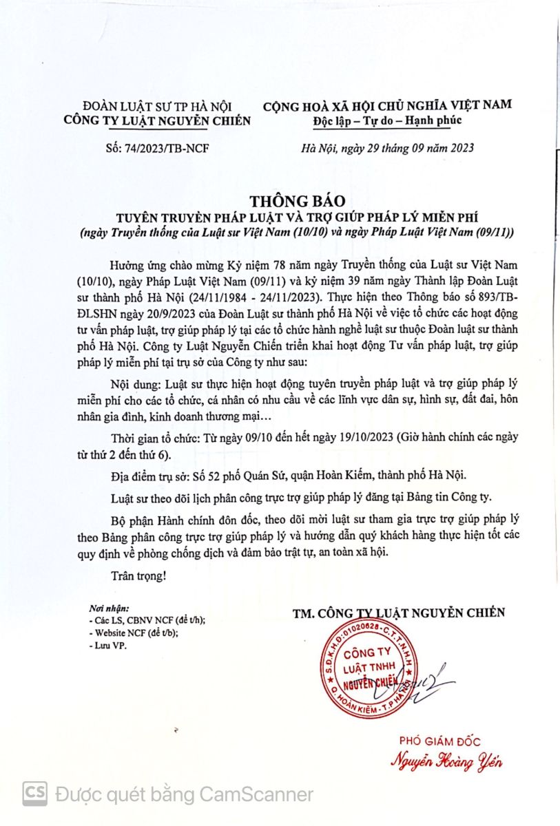 Hưởng ứng chào mừng Kỷ niệm 78 năm ngày Truyền thống của Luật sư Việt Nam (10/10), ngày Pháp Luật Việt Nam (09/11) và kỷ niệm 39 năm ngày Thành lập Đoàn Luật sư thành phố Hà Nội (24/11/1984 - 24/11/2023). Thực hiện theo Thông báo số 893/TB-ĐLSHN ngày 20/9/2023 của Đoàn Luật sư thành phố Hà Nội về việc tổ chức các hoạt động tư vấn pháp luật, trợ giúp pháp lý tại các tổ chức hành nghề luật sư thuộc Đoàn luật sư thành phố Hà Nội. Công ty Luật Nguyễn Chiến triển khai hoạt động Tư vấn pháp luật, trợ giúp pháp lý miễn phí tại trụ sở của Công ty như sau: