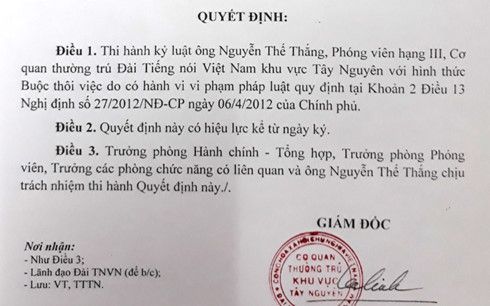 Cơ quan thường trú khu vực Tây Nguyên, Đài Tiếng nói Việt Nam đã ban hành quyết định kỷ luật buộc thôi việc đối với ông Nguyễn Thế Thắng.
