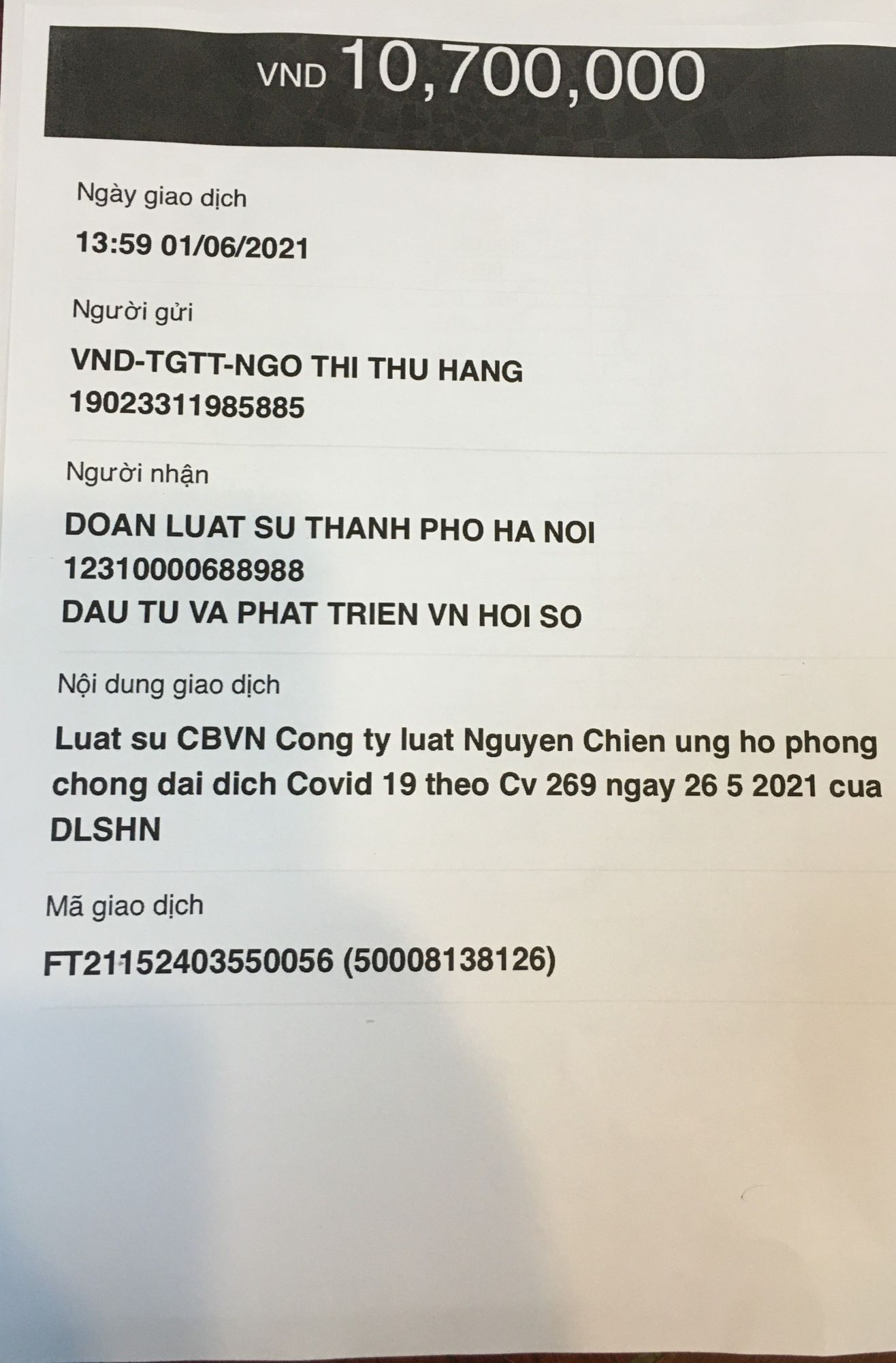 Toàn bộ số tiền kêu gọi ủng hộ được Công ty đã chuyển đến tài khoản của Đoàn Luật Sư thành phố Hà Nội để tham gia vào công cuộc phòng, chống dịch bệnh.