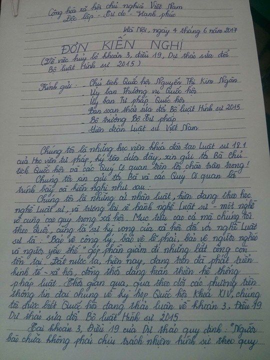 Cùng chung quan điểm như vậy, một lá đơn khác có nội dung tương tự đã được hàng chục học viên khóa đào tạo nghề luật sư lớp 18.1 Học viện Tư pháp viết tay và cùng ký tên gửi đến Quốc hội và các cơ quan chức năng. Lá đơn có đoạn: “đề nghị và khẩn cầu bà Chủ tịch Quốc hội và các quý cơ quan xem xét đề nghị bỏ khoản 3 Điều 19 ra khỏi dự thảo Bộ luật Hình sự 2015”.