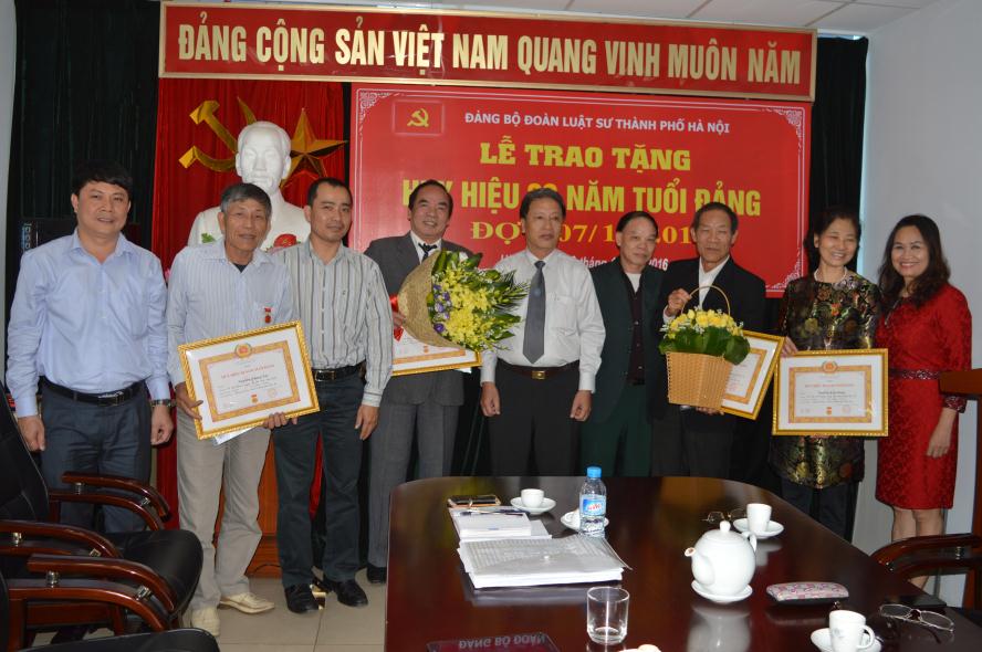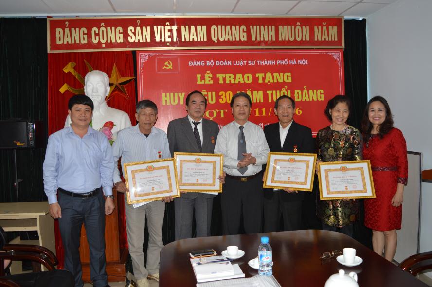 Thay mặt Đảng uỷ, đồng chí Lê Đức Bính - Bí thư Đảng ủy trao tặng huy hiệu 30 năm tuổi Đảng cho đảng viên Từ Văn Nhũ thuộc Chi bộ luật sư Hai Bà Trưng 6, đảng viên Nguyễn Thành Trì thuộc Chi bộ luật sư Ba Đình 3, đảng viên Nguyễn Kim Dung và đảng viên Nguyễn Quang Lộc thuộc Chi bộ Hai Bà Trưng 5.
