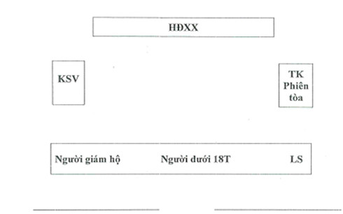 Mô hình phiên tòa hình sự xét xử bị cáo dưới 18 tuổi được bố trí những người tiến hành tố tụng và người tham gia tố tụng đều ngồi trên một mặt phẳng. HĐXX ngồi ở giữa. Đại diện VKS ngồi ở bên phải của HĐXX. Thư ký phiên tòa ngồi ở bên trái HĐXX. Người giám hộ, người dưới 18 tuổi, luật sư bào chữa, bảo vệ quyền và lợi ích hợp pháp ch người dưới 18 tuoir ngồi đối diện HĐXX.